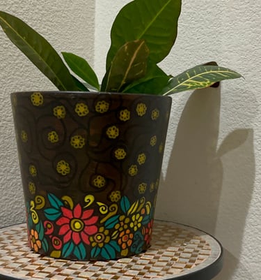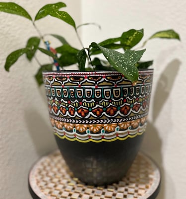 The exploration of vases and plant holders emerged as a captivating endeavor for me, especially during the pandemic. Delving into these mediums proved to be a fulfilling experience, yielding sustainable and aesthetically pleasing results. After procuring planters and vases, I meticulously prepared, painted, and finalized them with a protective varnish to shield against water and dust. It's worth noting that these creations are crafted for decorative purposes and are not intended for serving food.