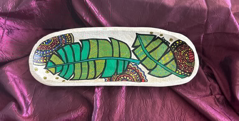 Recently, I've delved into the realm of raw, unfinished wood and bamboo as natural mediums. Much like pot painting, these pieces boast uniqueness and versatility, serving as decorative tabletops, side stands, trays, and more. Procuring wooden cheeseboards and turntable tops, I meticulously prepared, painted, and applied a protective varnish to guard against water and dust. It's essential to note that while these creations add aesthetic charm, they are not intended for serving food.