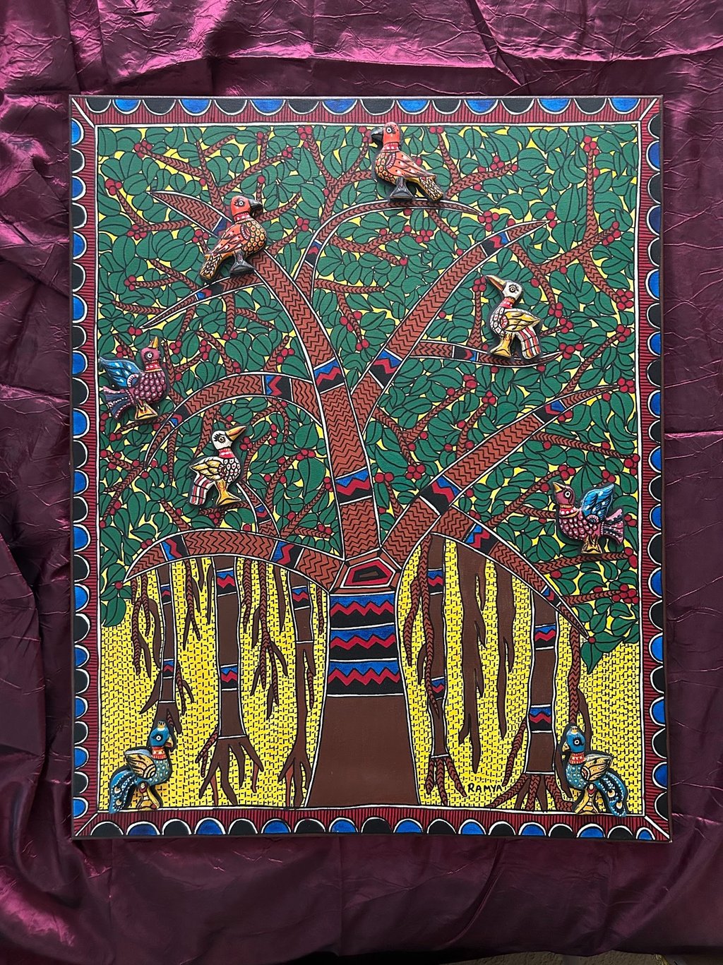 Acrylic paint on Canvas with Embossed Wooden Birds