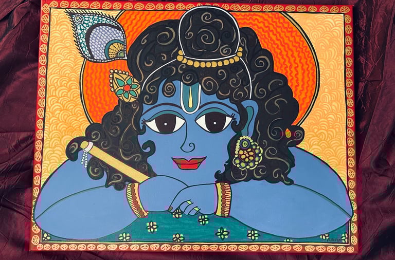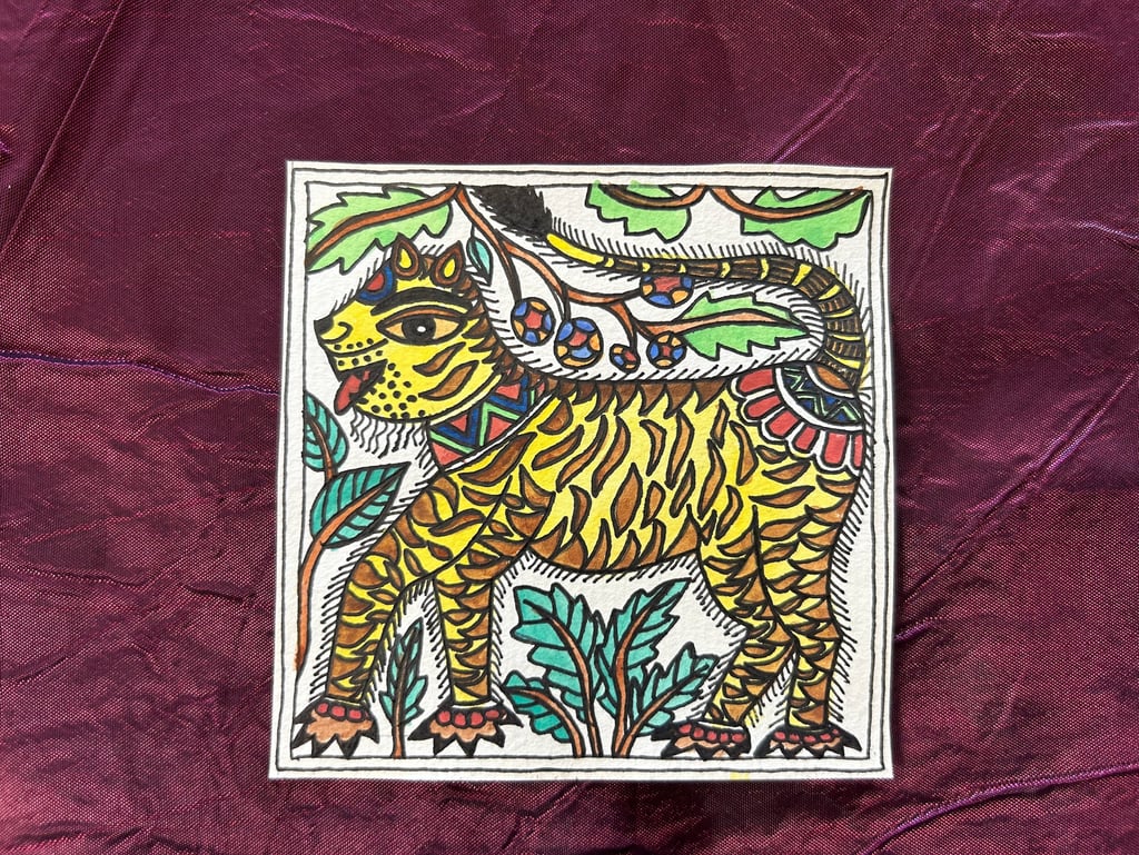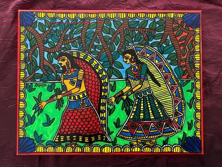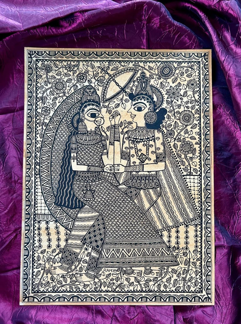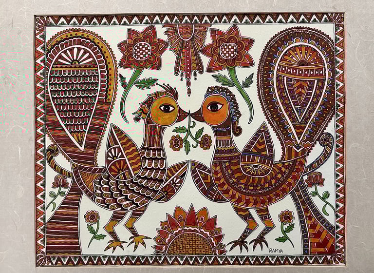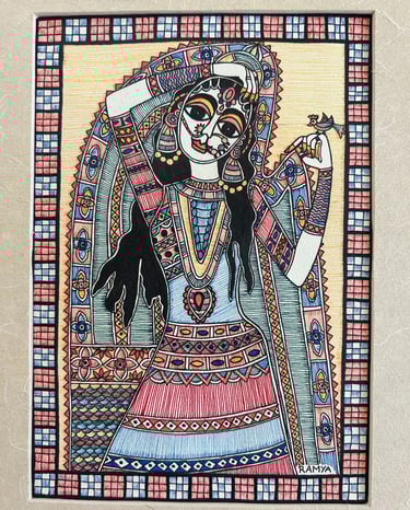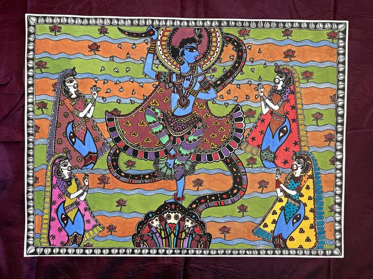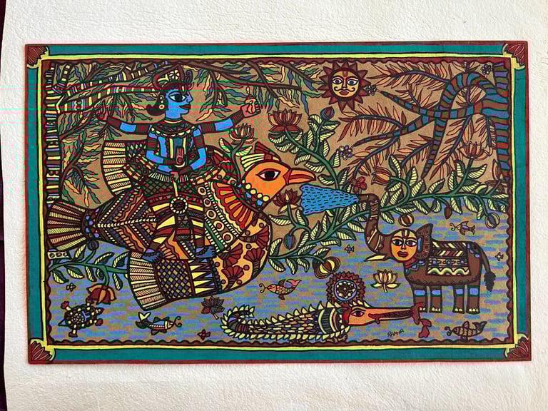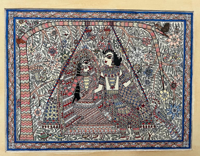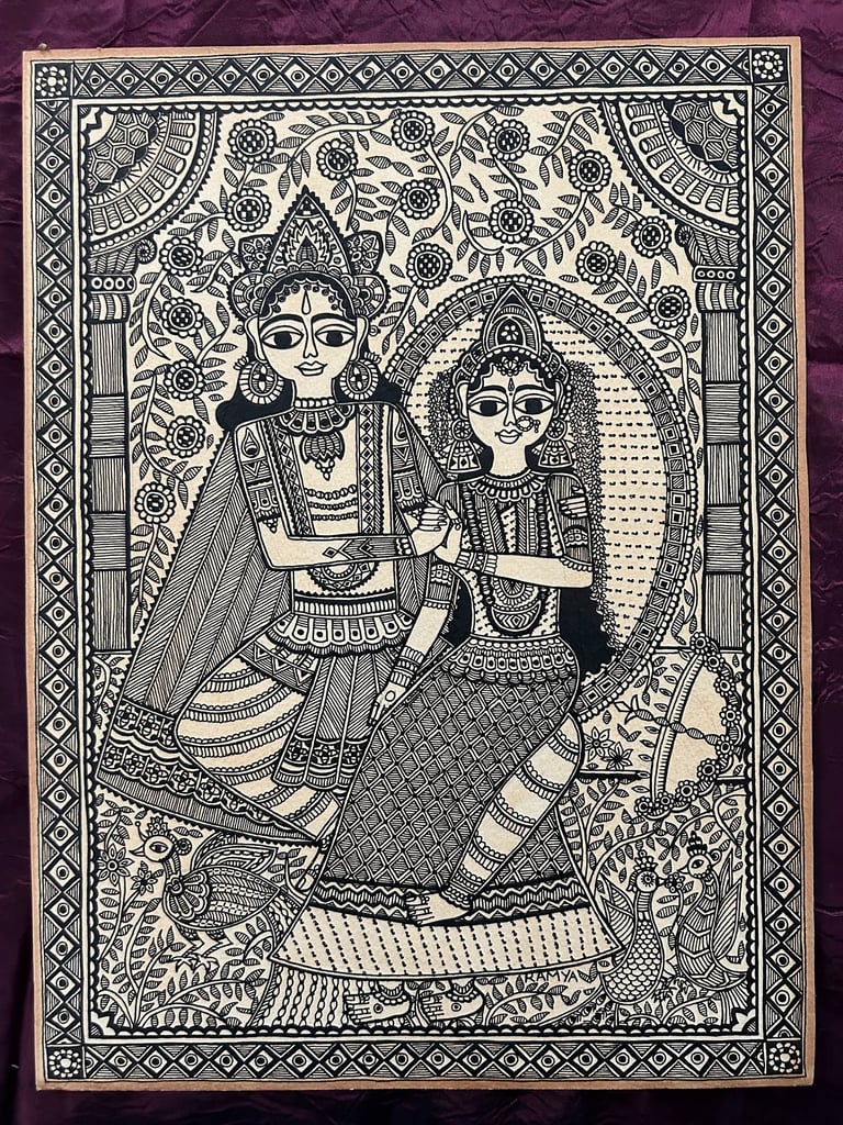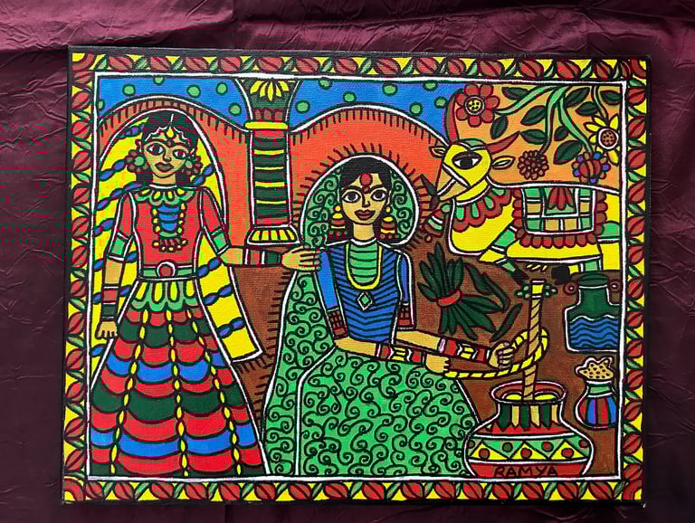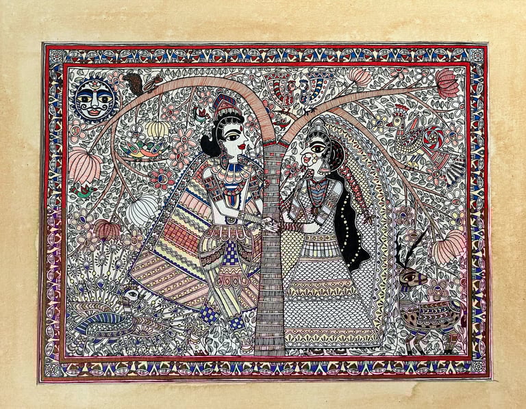 Madhubani art holds a deep cultural and historical importance, tracing its origins back to ancient times within the folk traditions of India. The art form frequently portrays scenes from Hindu mythology, nature, and everyday life. These paintings are characterized by intricate motifs, including flowers, birds, animals, and mythological figures. Beyond mere aesthetics, Madhubani art often conveys symbolic meanings and narratives. I present three distinct Madhubani styles: Bharni, characterized by vibrant colors; Kachni, defined by fine lines; and Godhna, featuring miniature figures akin to tattoos.