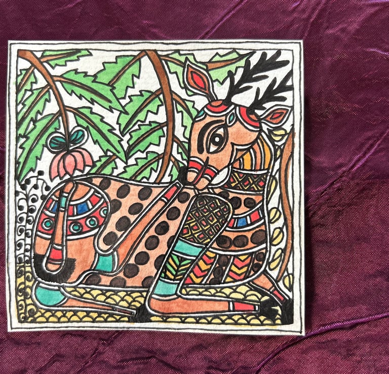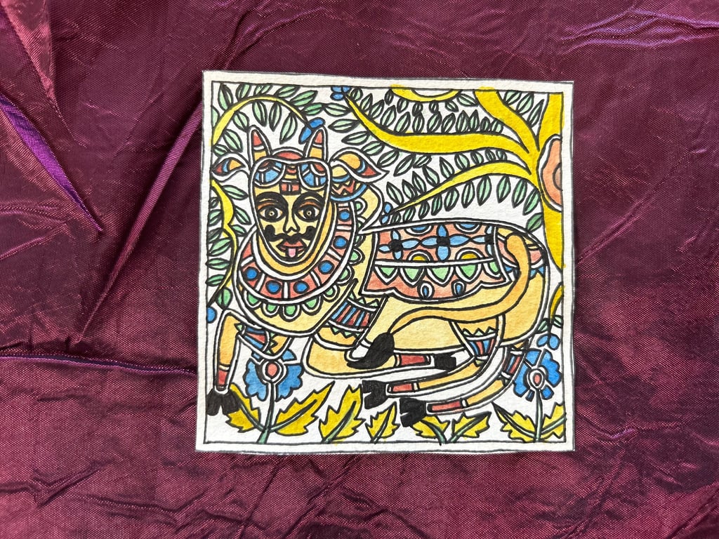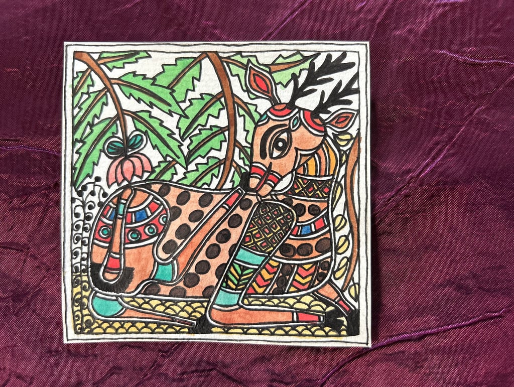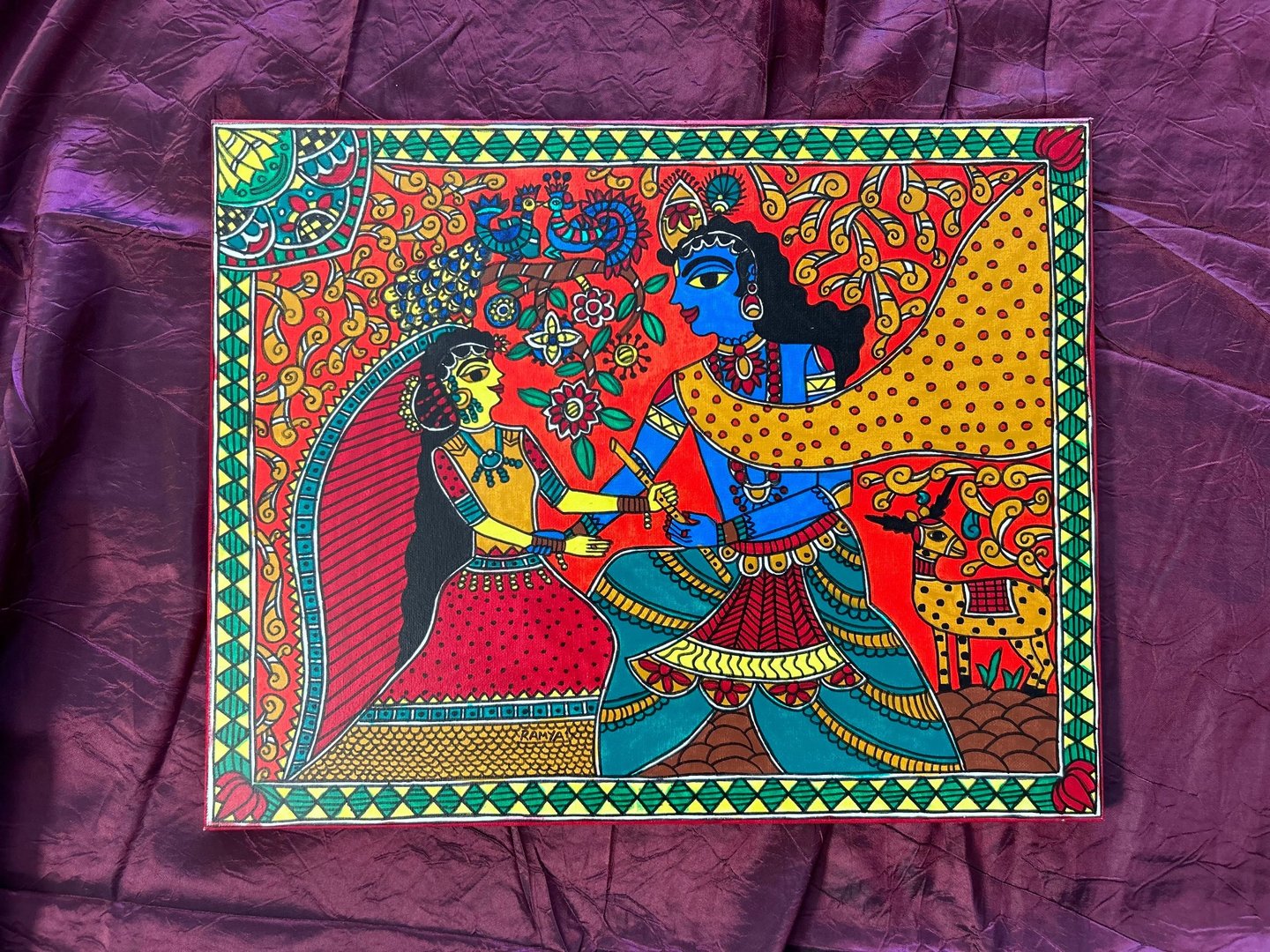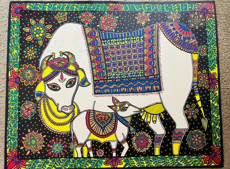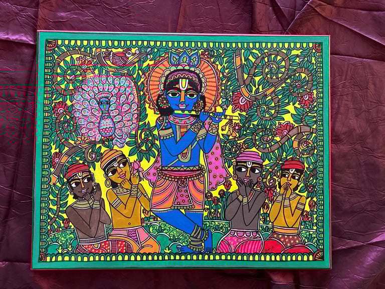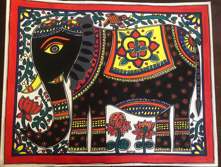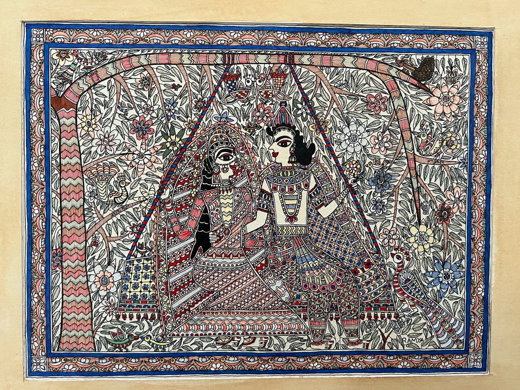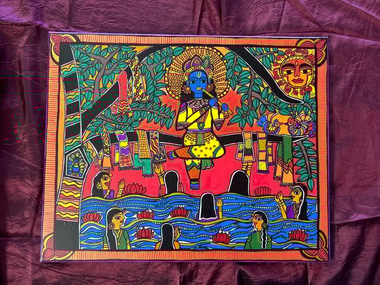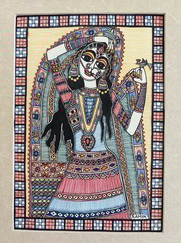 Madhubani art holds a deep cultural and historical importance, tracing its origins back to ancient times within the folk traditions of India. The art form frequently portrays scenes from Hindu mythology, nature, and everyday life. These paintings are characterized by intricate motifs, including flowers, birds, animals, and mythological figures. Beyond mere aesthetics, Madhubani art often conveys symbolic meanings and narratives. I present three distinct Madhubani styles: Bharni, characterized by vibrant colors; Kachni, defined by fine lines; and Godhna, featuring miniature figures akin to tattoos.