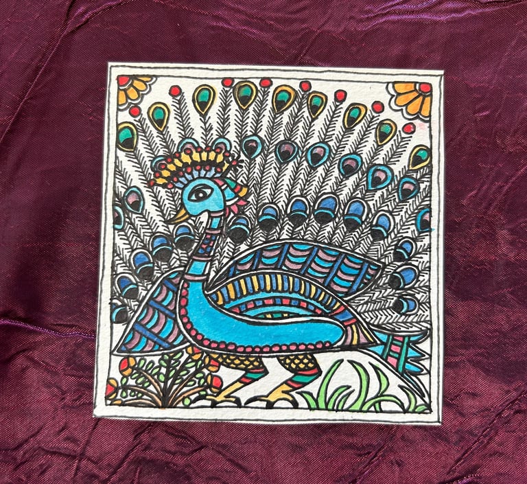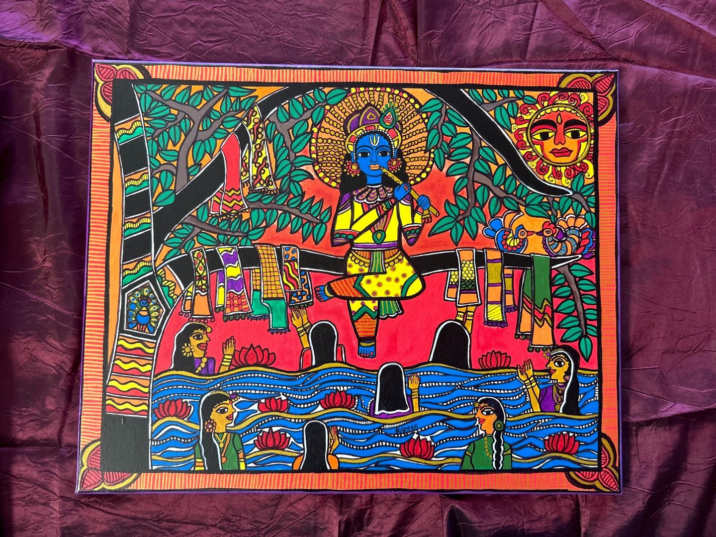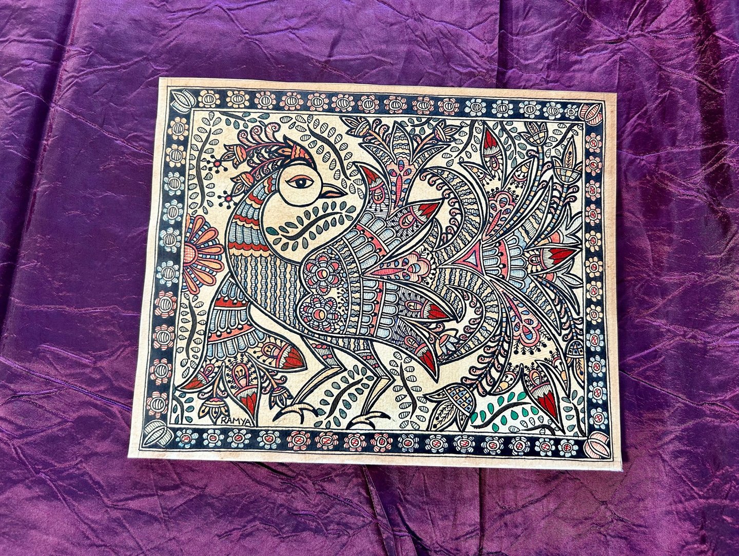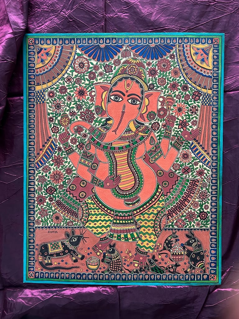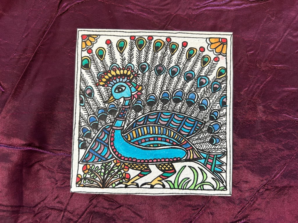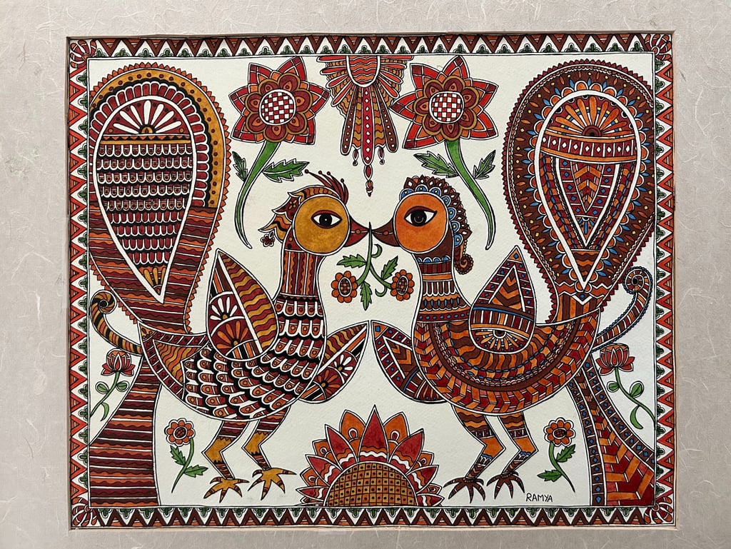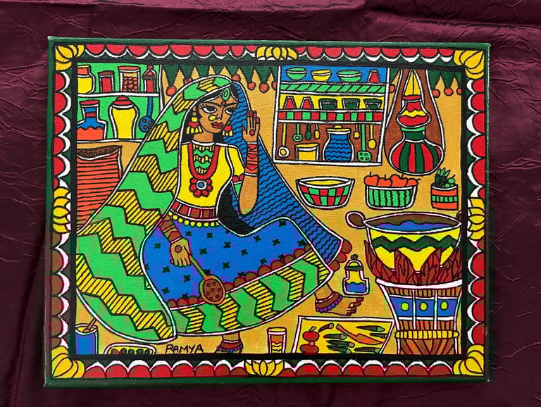 Madhubani art holds a deep cultural and historical importance, tracing its origins back to ancient times within the folk traditions of India. The art form frequently portrays scenes from Hindu mythology, nature, and everyday life. These paintings are characterized by intricate motifs, including flowers, birds, animals, and mythological figures. Beyond mere aesthetics, Madhubani art often conveys symbolic meanings and narratives. I present three distinct Madhubani styles: Bharni, characterized by vibrant colors; Kachni, defined by fine lines; and Godhna, featuring miniature figures akin to tattoos.