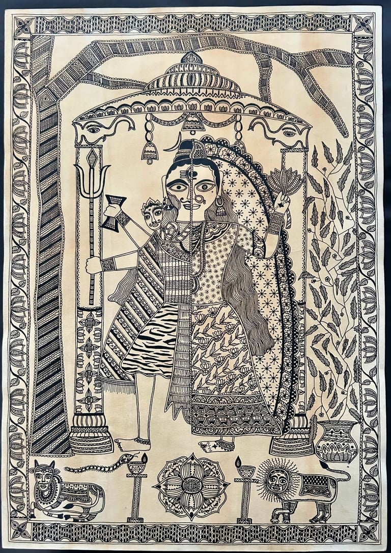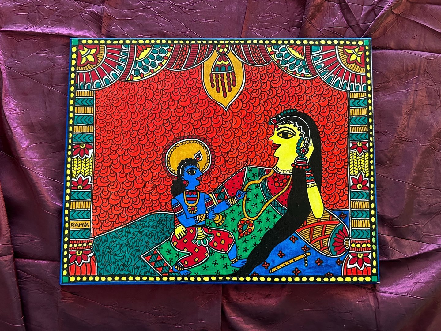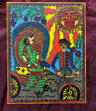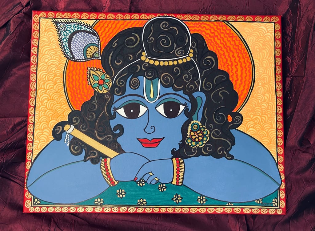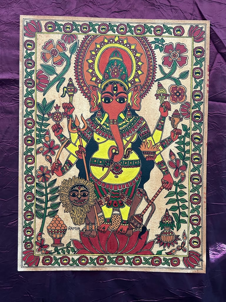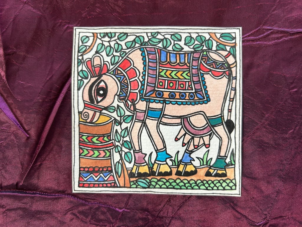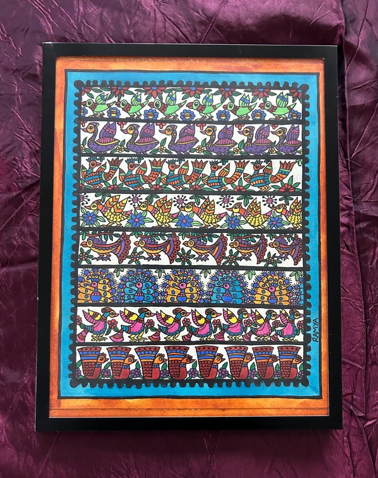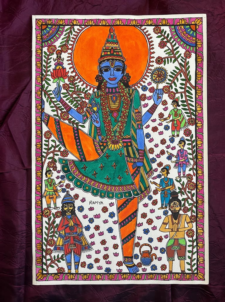 Madhubani art holds a deep cultural and historical importance, tracing its origins back to ancient times within the folk traditions of India. The art form frequently portrays scenes from Hindu mythology, nature, and everyday life. These paintings are characterized by intricate motifs, including flowers, birds, animals, and mythological figures. Beyond mere aesthetics, Madhubani art often conveys symbolic meanings and narratives. I present three distinct Madhubani styles: Bharni, characterized by vibrant colors; Kachni, defined by fine lines; and Godhna, featuring miniature figures akin to tattoos.