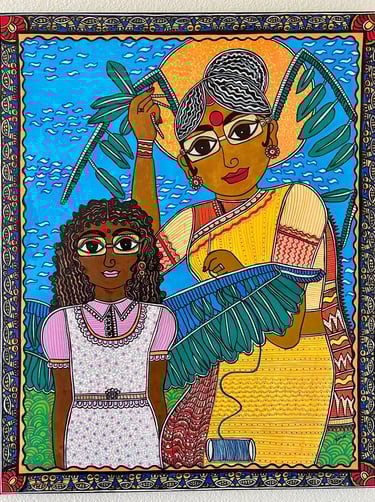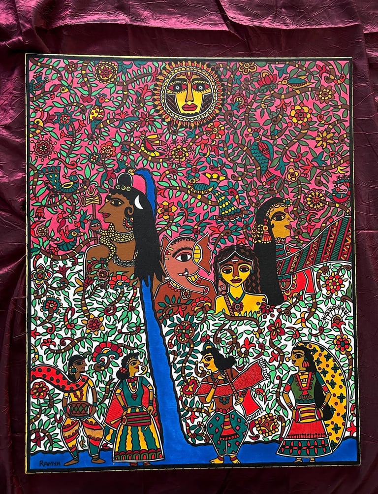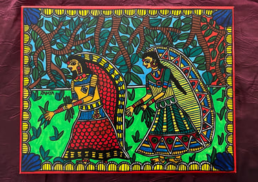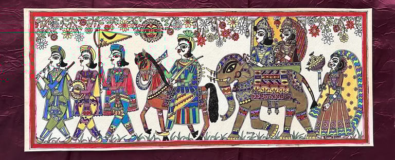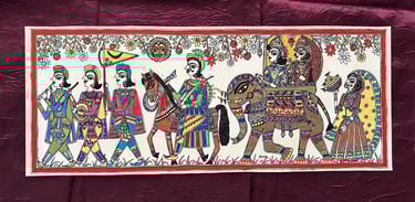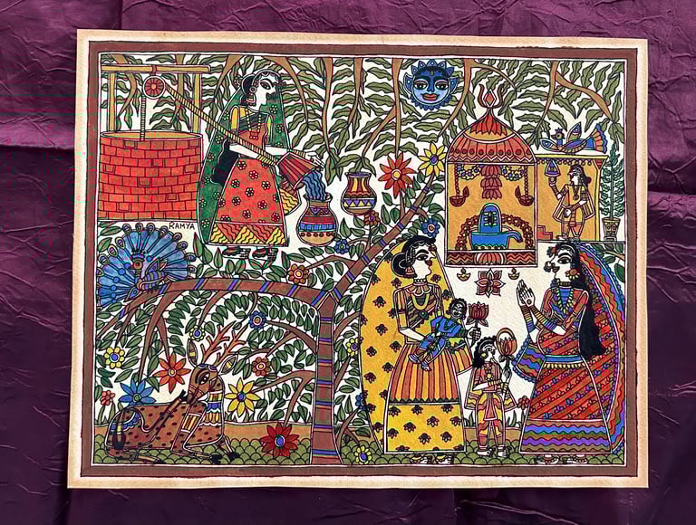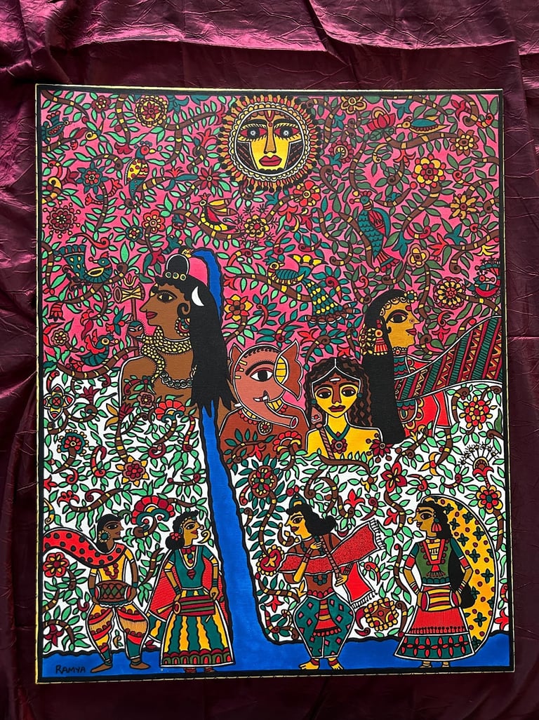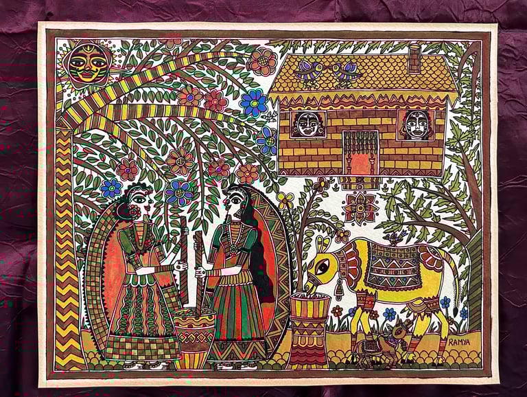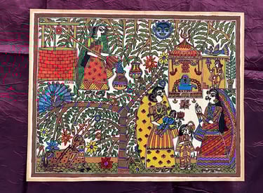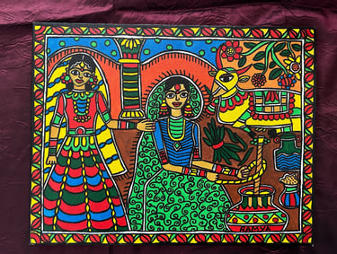 Madhubani art, deeply entrenched in India's folk traditions, served as a powerful tool for imparting cultural knowledge to younger generations. Within the ancient Mithila region, now in Bihar, India, the walls of homes and communities were once adorned with these captivating artworks. These intricate depictions not only adorned spaces but also became vivid storytellers, narrating tales of cultural practices, family life, societal norms, and festive celebrations to those who beheld them.