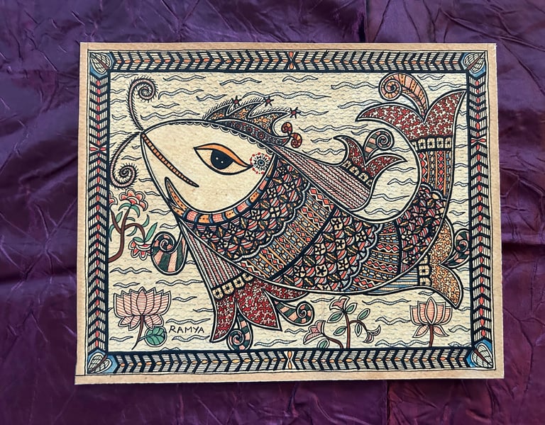 Take, for instance, the majestic Elephant—a symbol embodying strength, wisdom, solitude, unwavering loyalty to family, and intelligence. Likewise, the portrayal of Fish serves as a powerful symbol of fertility and prosperity, adding layers of meaning and cultural significance to the vibrant canvas of Madhubani art.